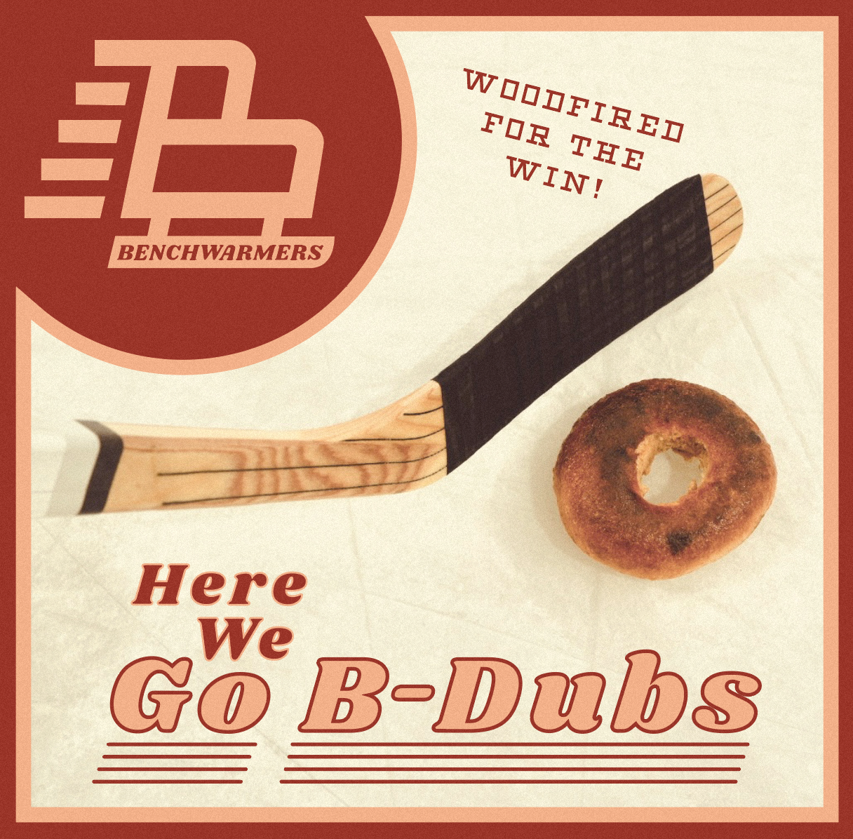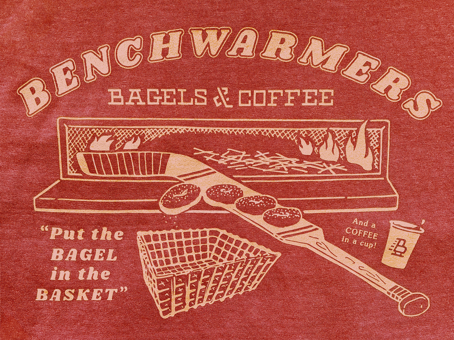 A slabby B is transformed into a old time hockey skate, angled for speed naturally. Continuing Benchwarmers’ adulation with everyday athletes and adoration of all things sport, the ‘Goalie Goal’ shirt reimagines the hockey idiom “Put the biscuit in the basket” describing a goalie scoring a goal into an empty net at the end of a hard fought win.