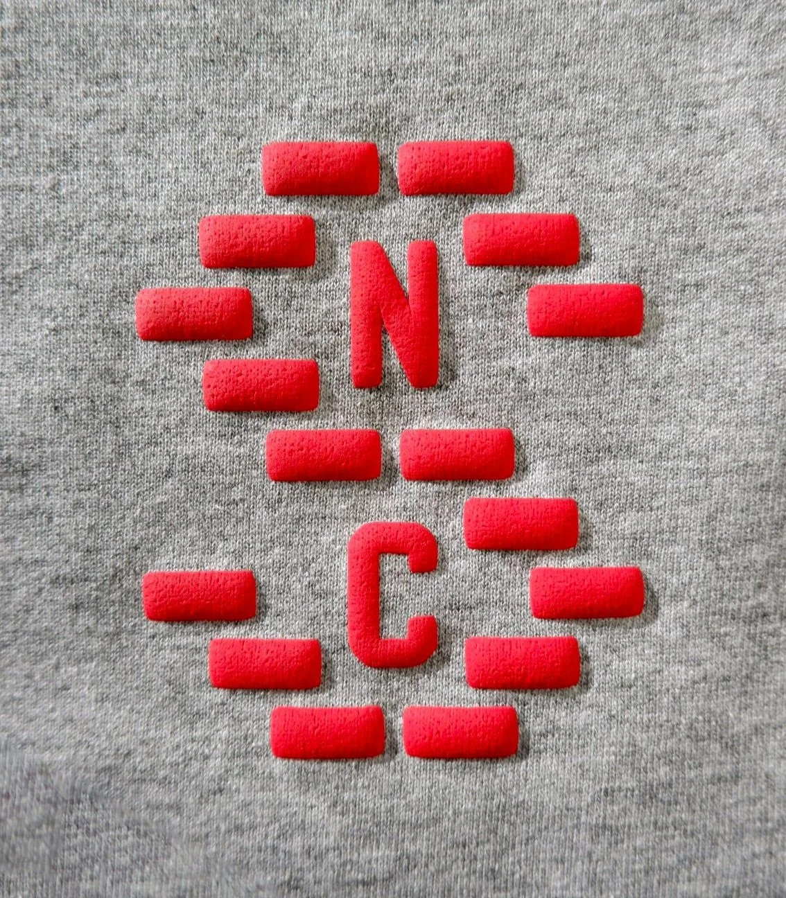 The script flips with a red logo on athletic gray reminiscent of the University’s standard issue gym attire but taken to another level with puff printing for a brick-like impression.