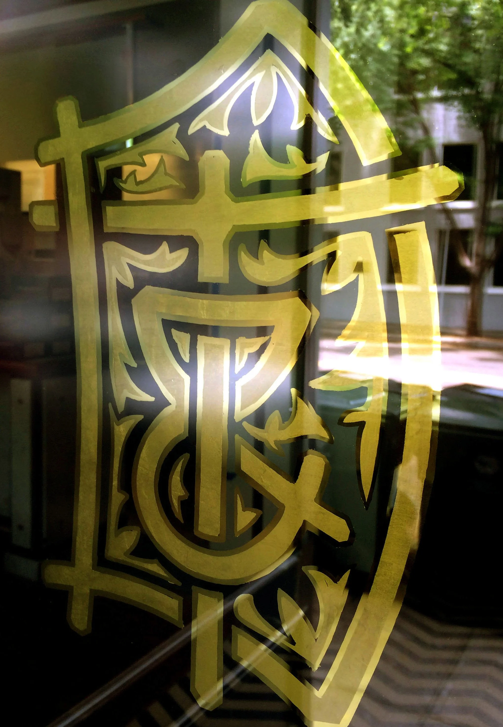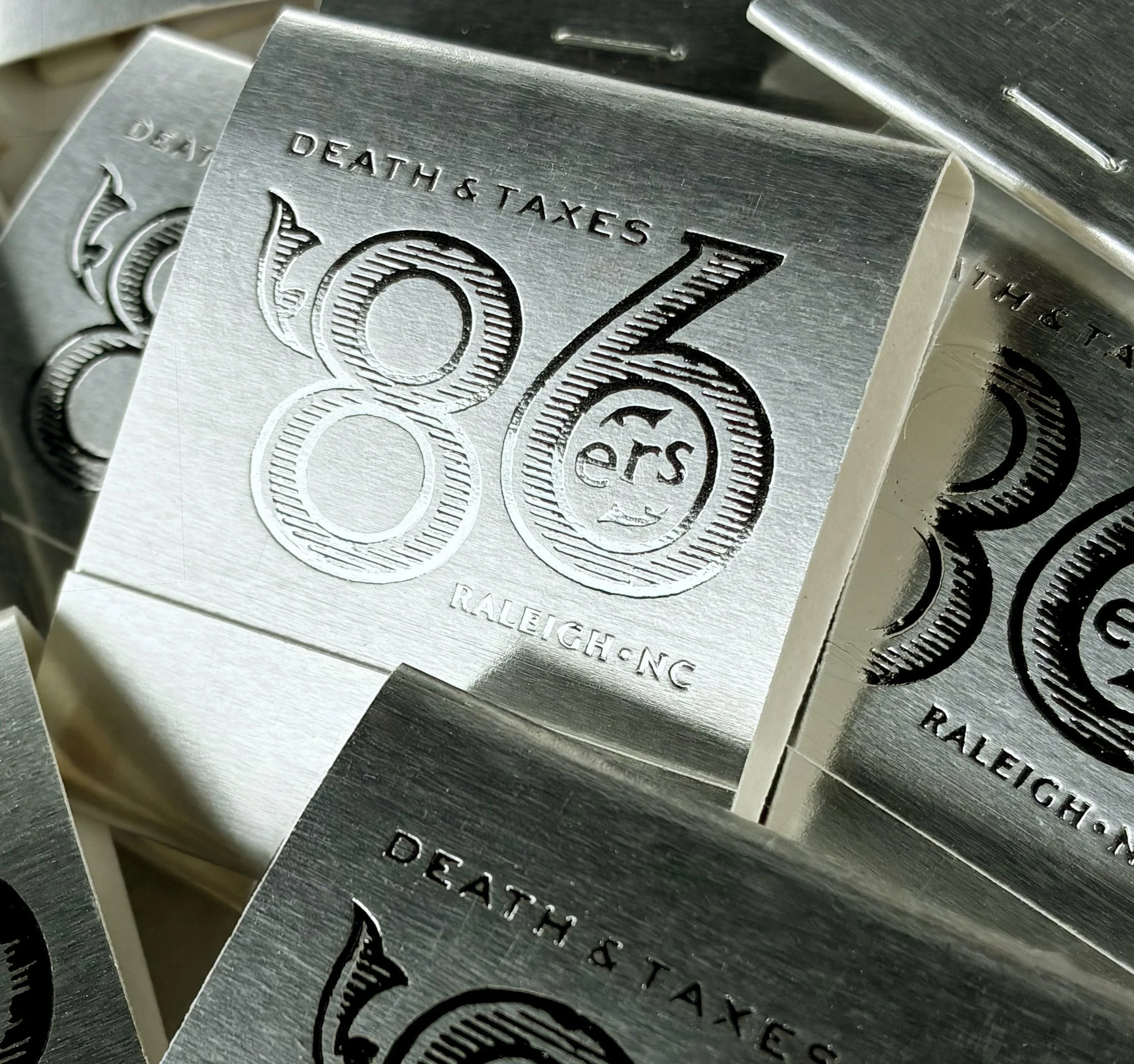Death & Taxes' identity references four symbols: fire representing technique; an hourglass for time; a flourish inspired by the massive bank vault in the basement; and a cleaver for, well, the name of the restaurant.