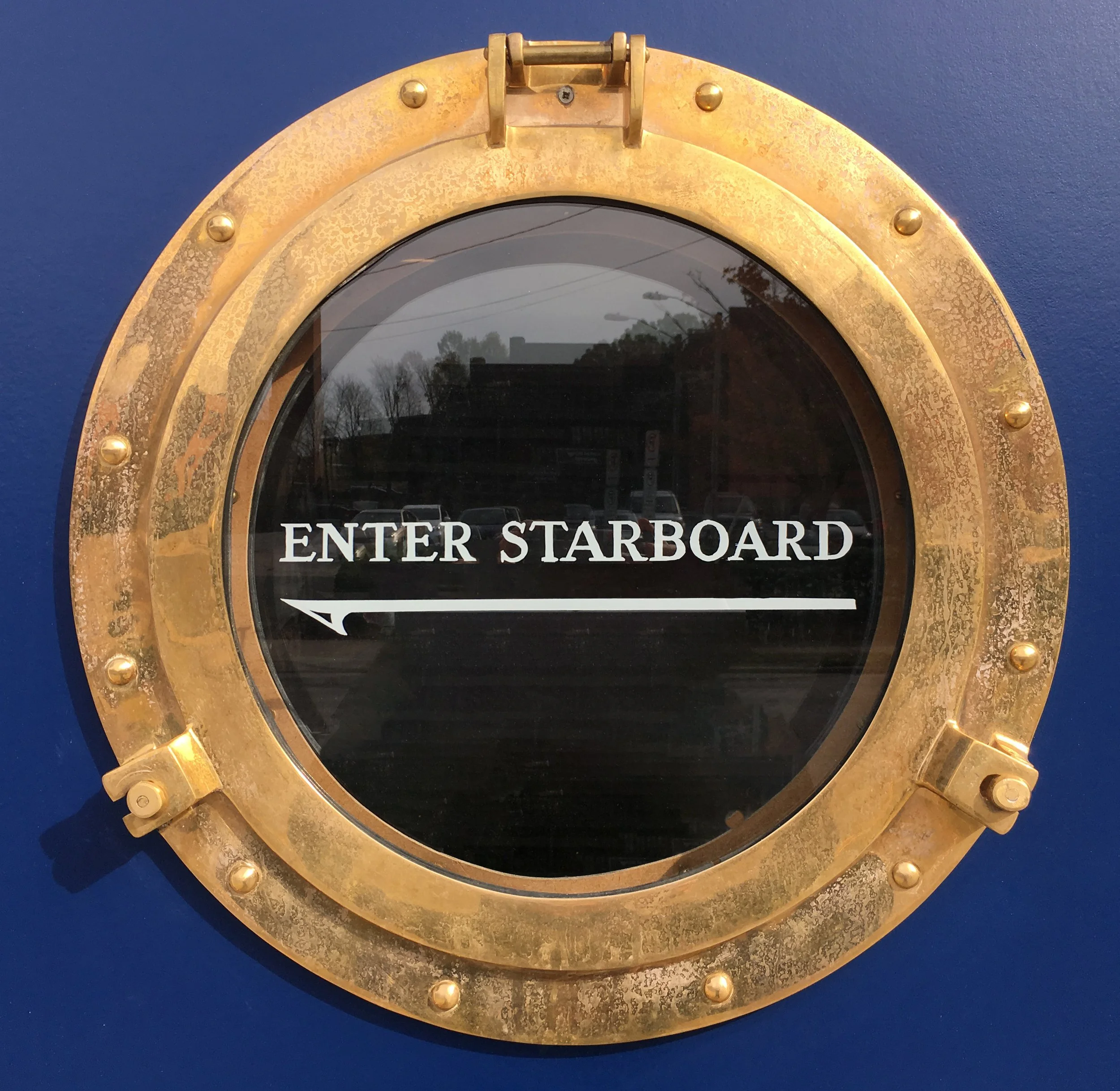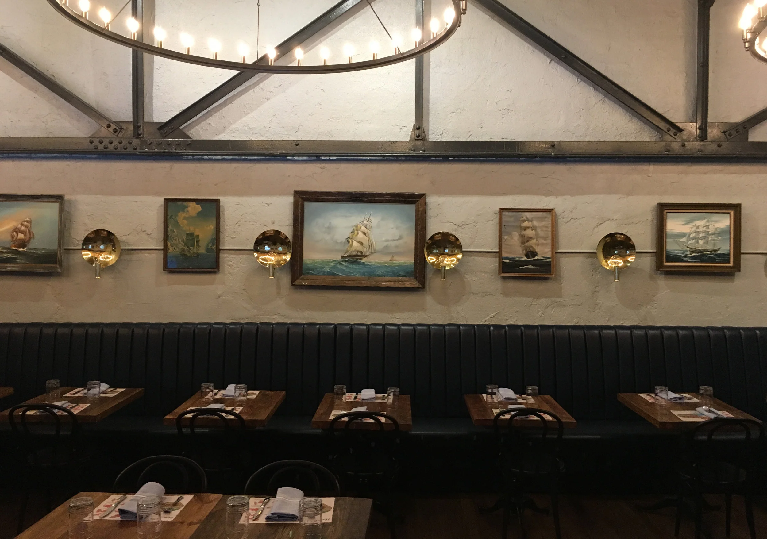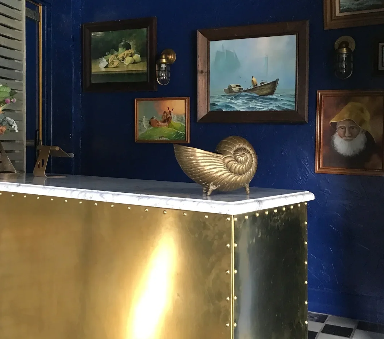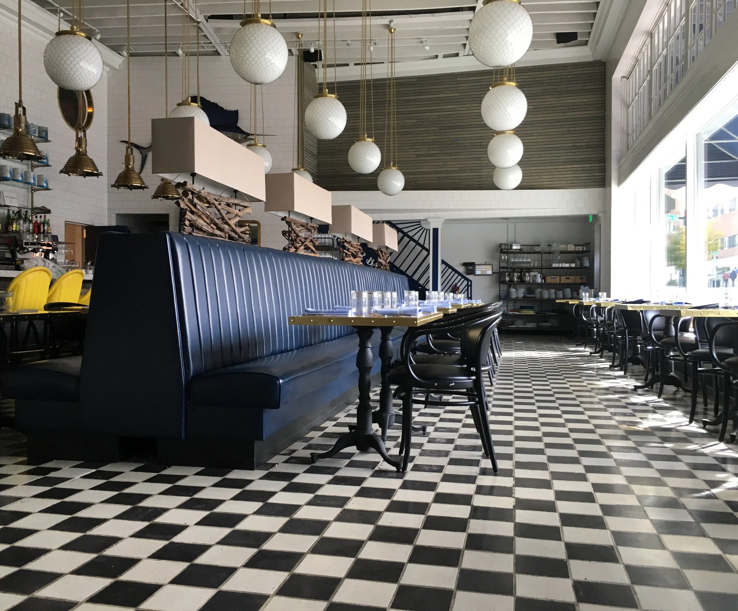 Inside original checkerboard floors meet brass table tops, driftwood lamps, navy banquettes, and slicker-yellow bar stools.