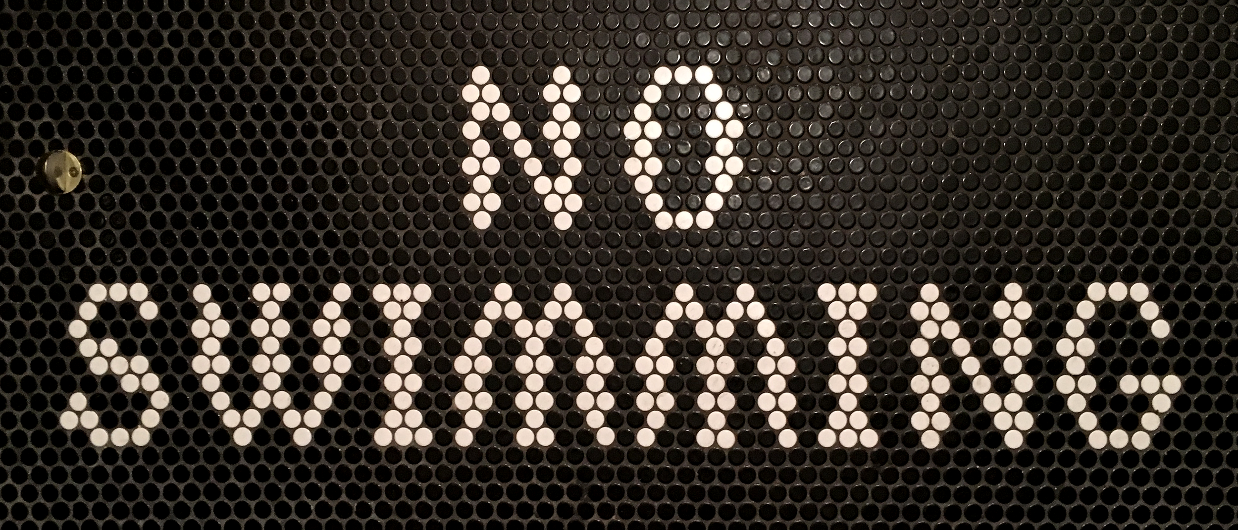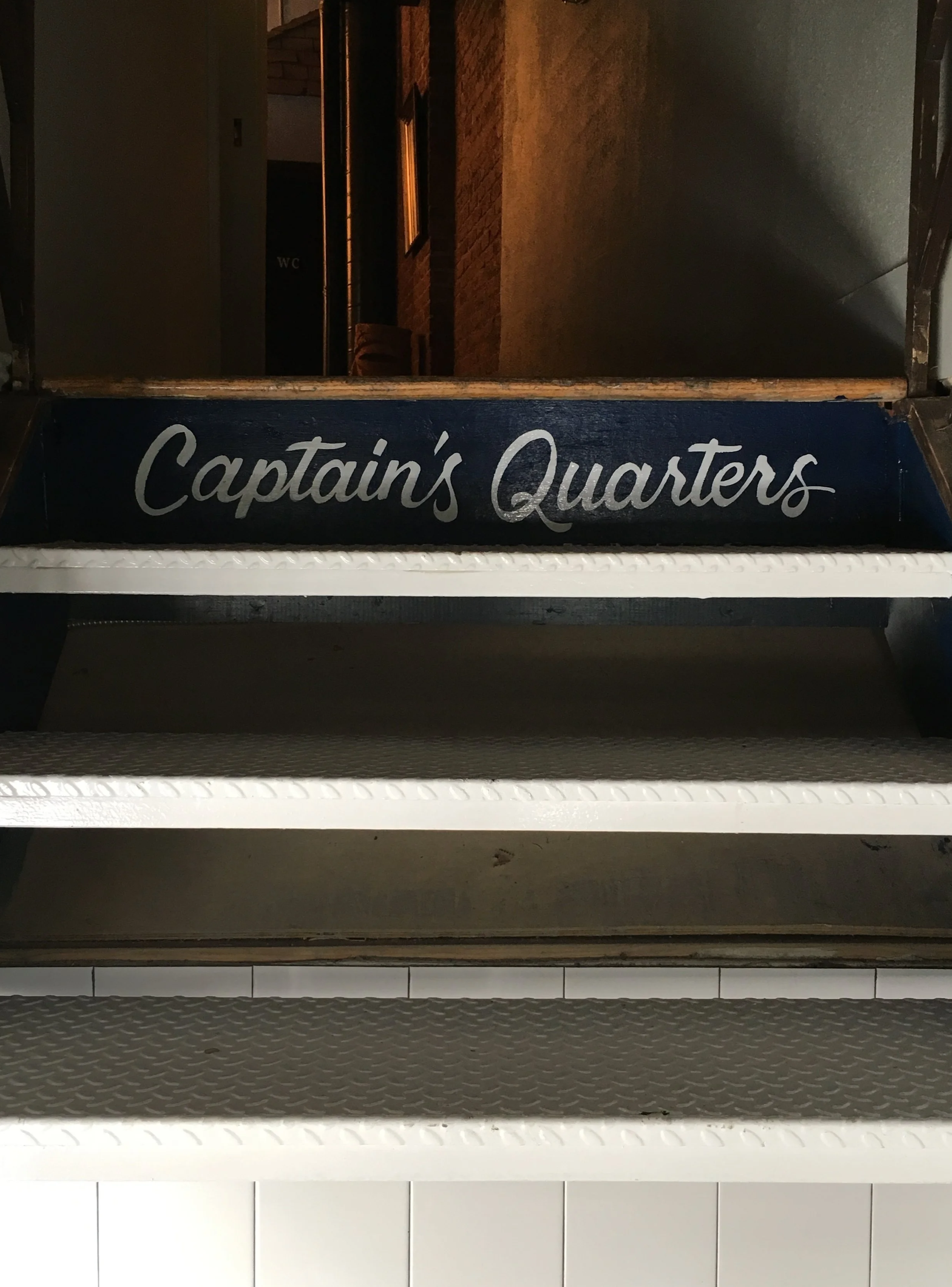 Upstairs hand-painted signage on the top stair riser signals an entrance into the Captain's Quarters where the interior departs from bright white, black, and navy to a more cozy feel, embracing the existing stucco and wood paneling.