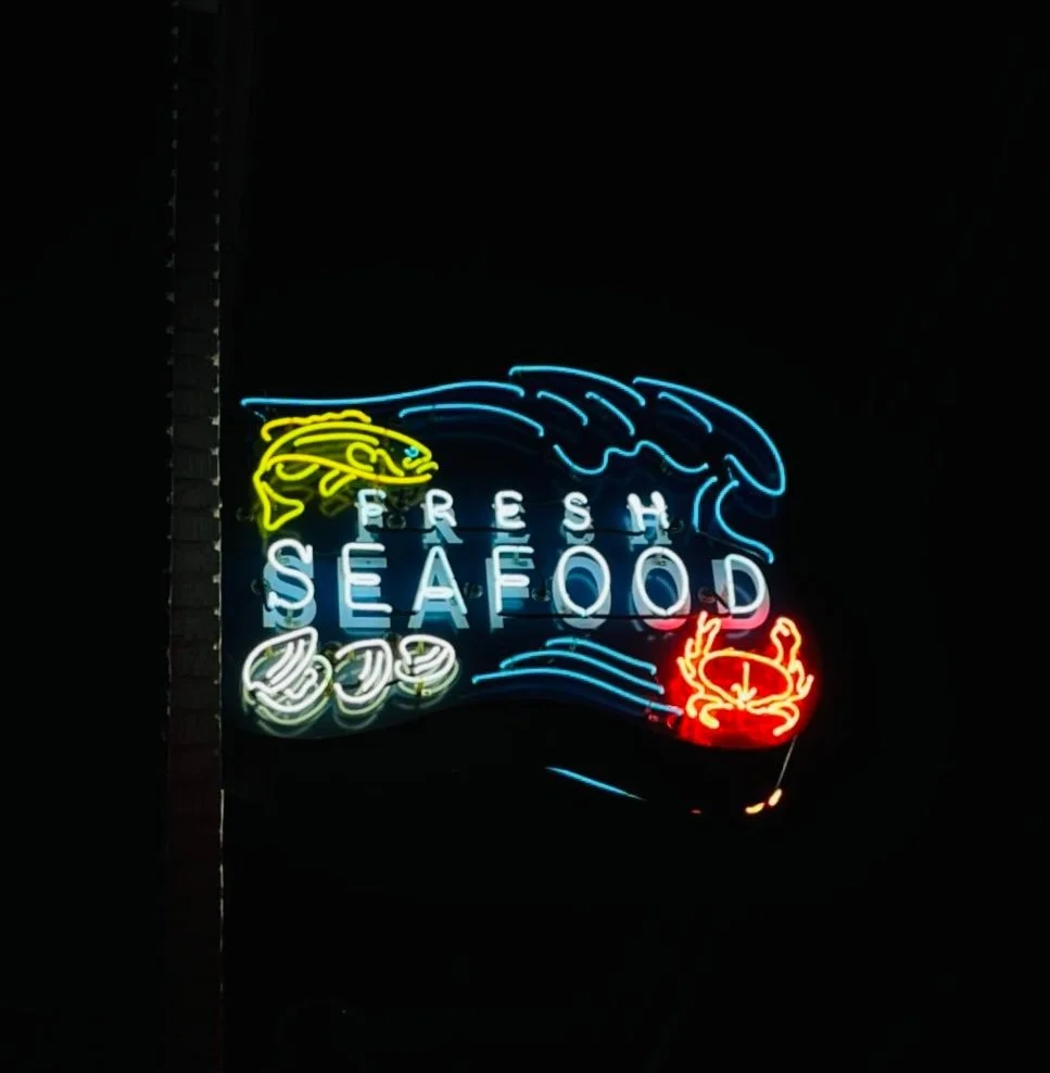 The two-story facade features clean white brick, an impressive scalloped awning with embroidered logo, and a four-color wave-shaped neon sign announcing the restaurant's calling.
