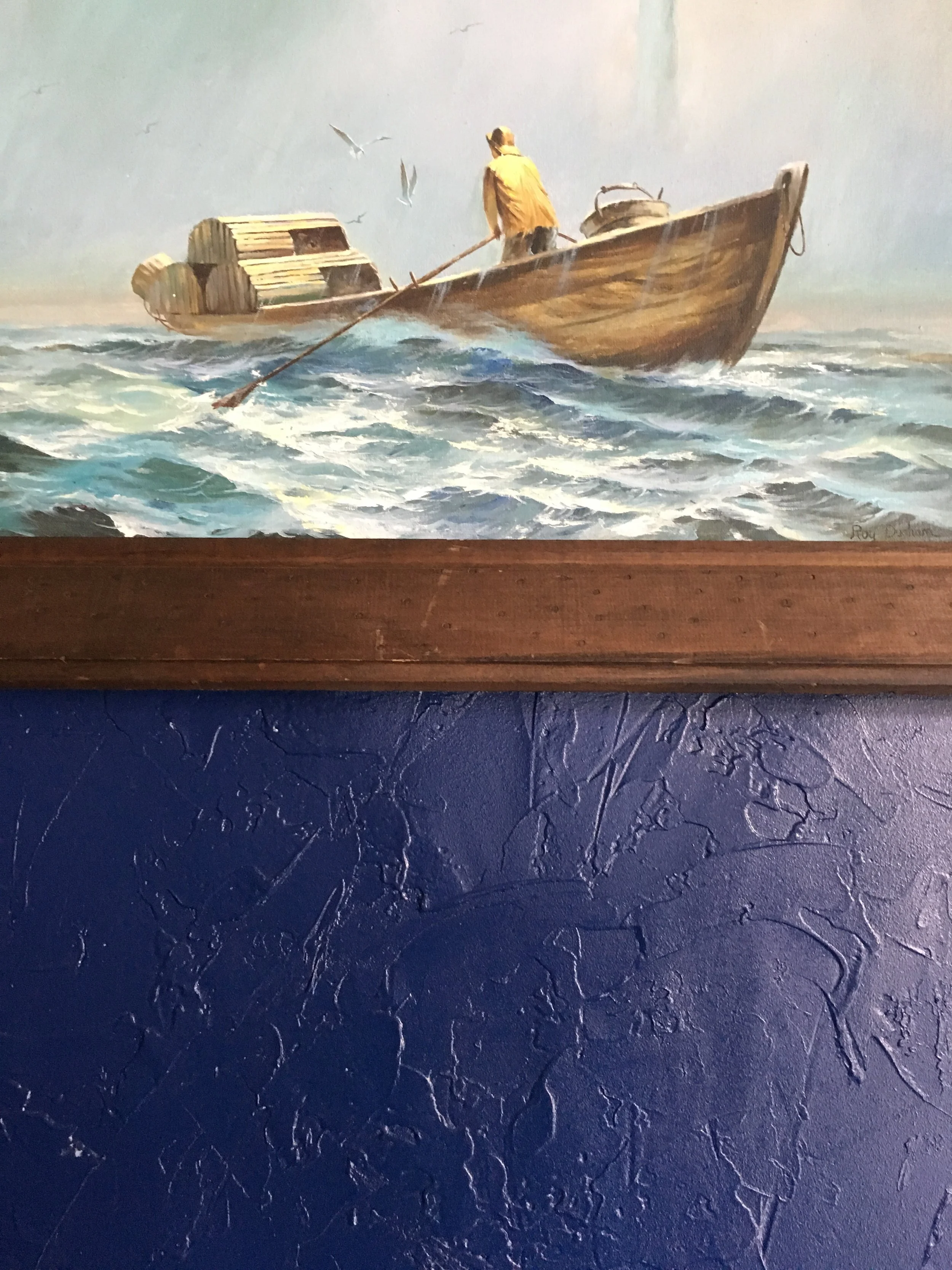 The welcome area features large plaster pulled walls evoking a stormy sea painting of which chef Kelly has many.